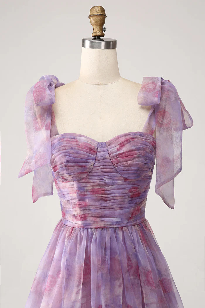 Purple Printed A Line Pleated Long Prom Dress,SSR1205