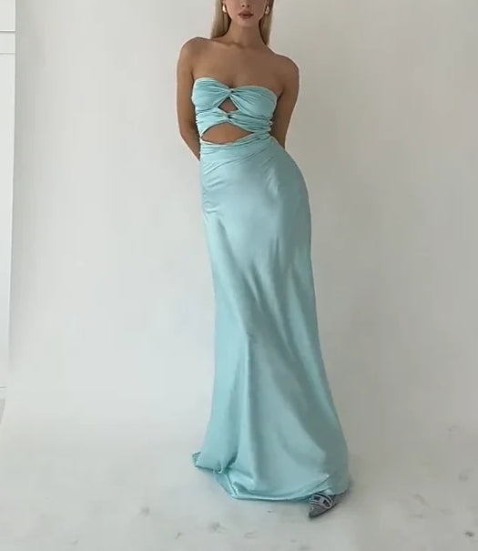 Light Blue Strapless Satin Simple Long Prom Dress Yellow Off Shoulder Sexy Party Dress