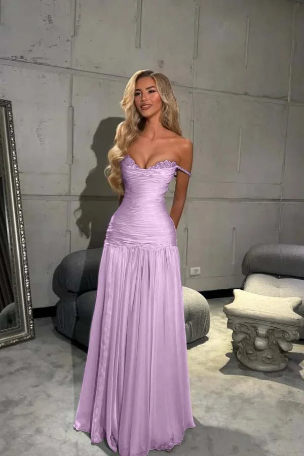 Off the Shoulder Sleeveless Long Prom Dress With Pleated Sequins