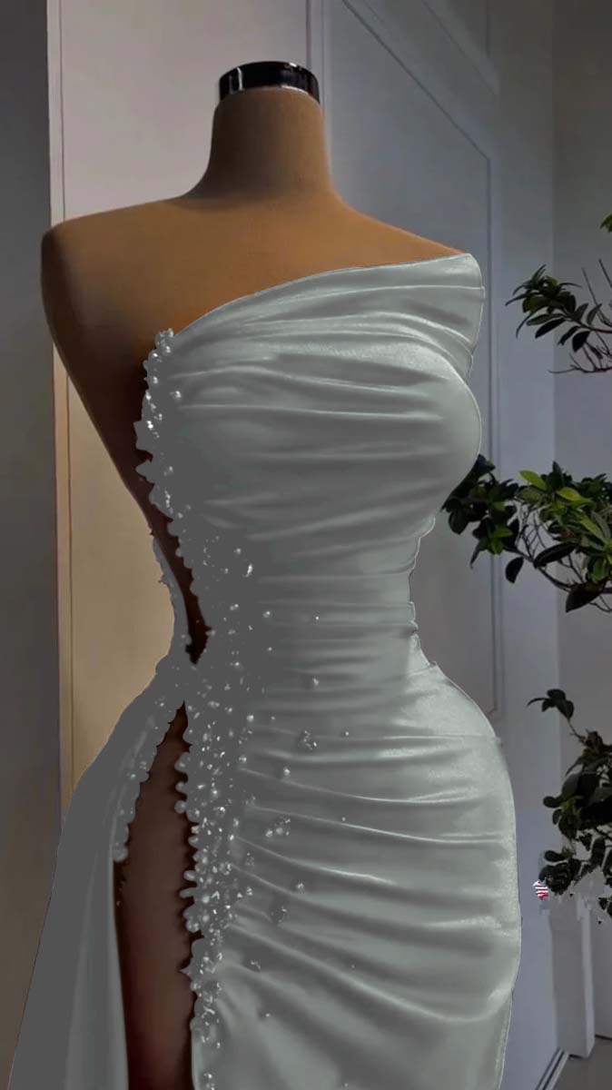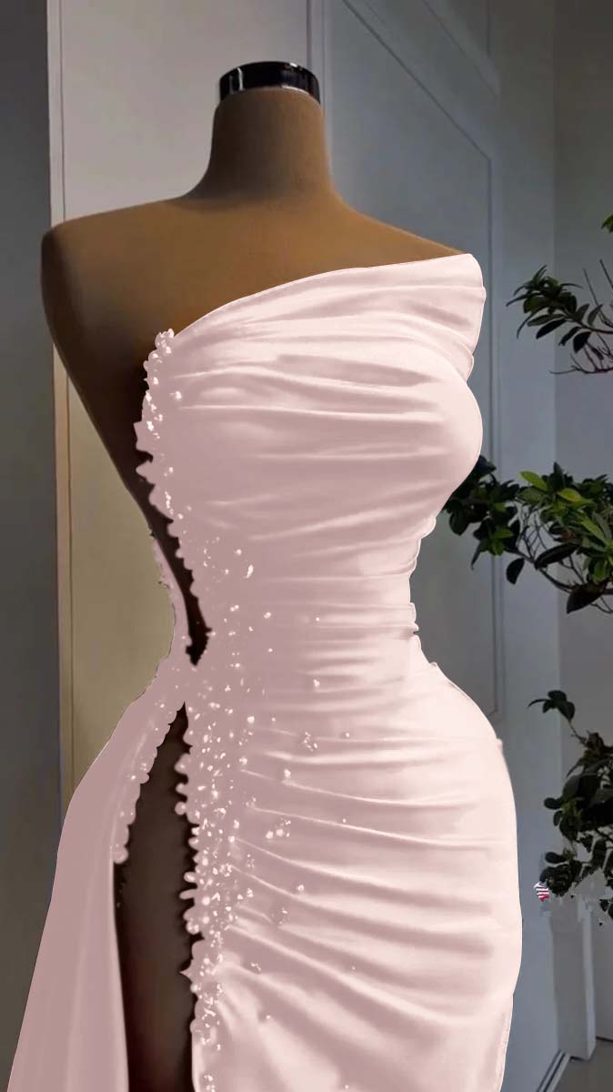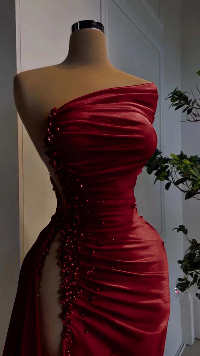 Red Pearl Strapless Prom Dress Long Slit Sleeveless YH0053