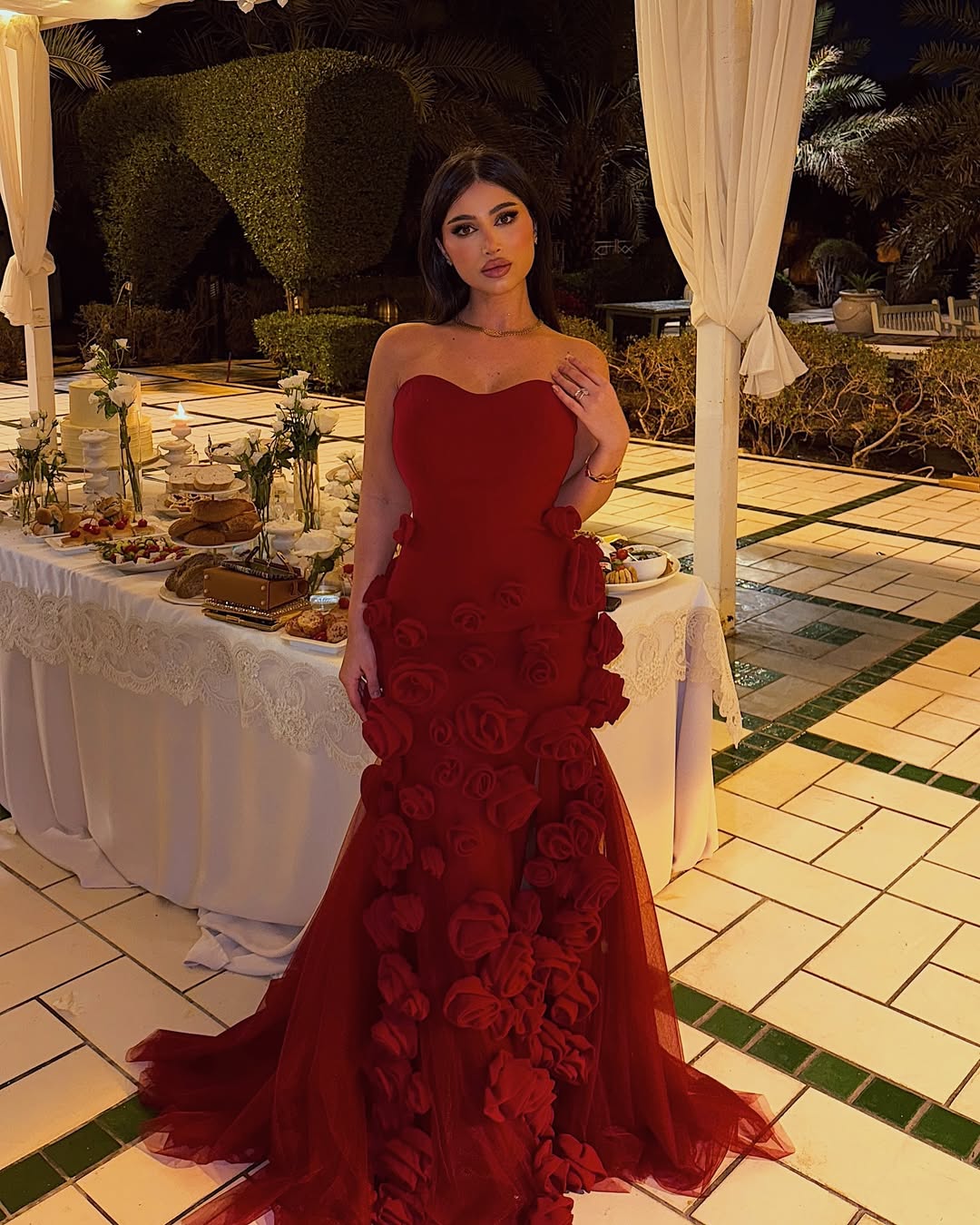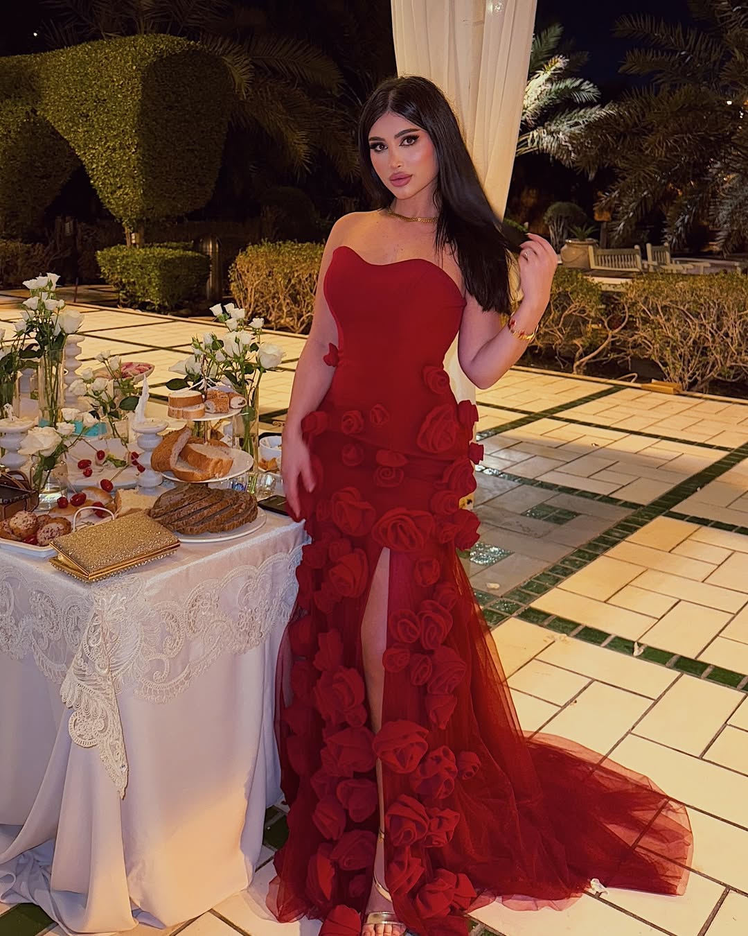 Red Split Strapless Handmade Flowers Long Prom Dress ssr0598
