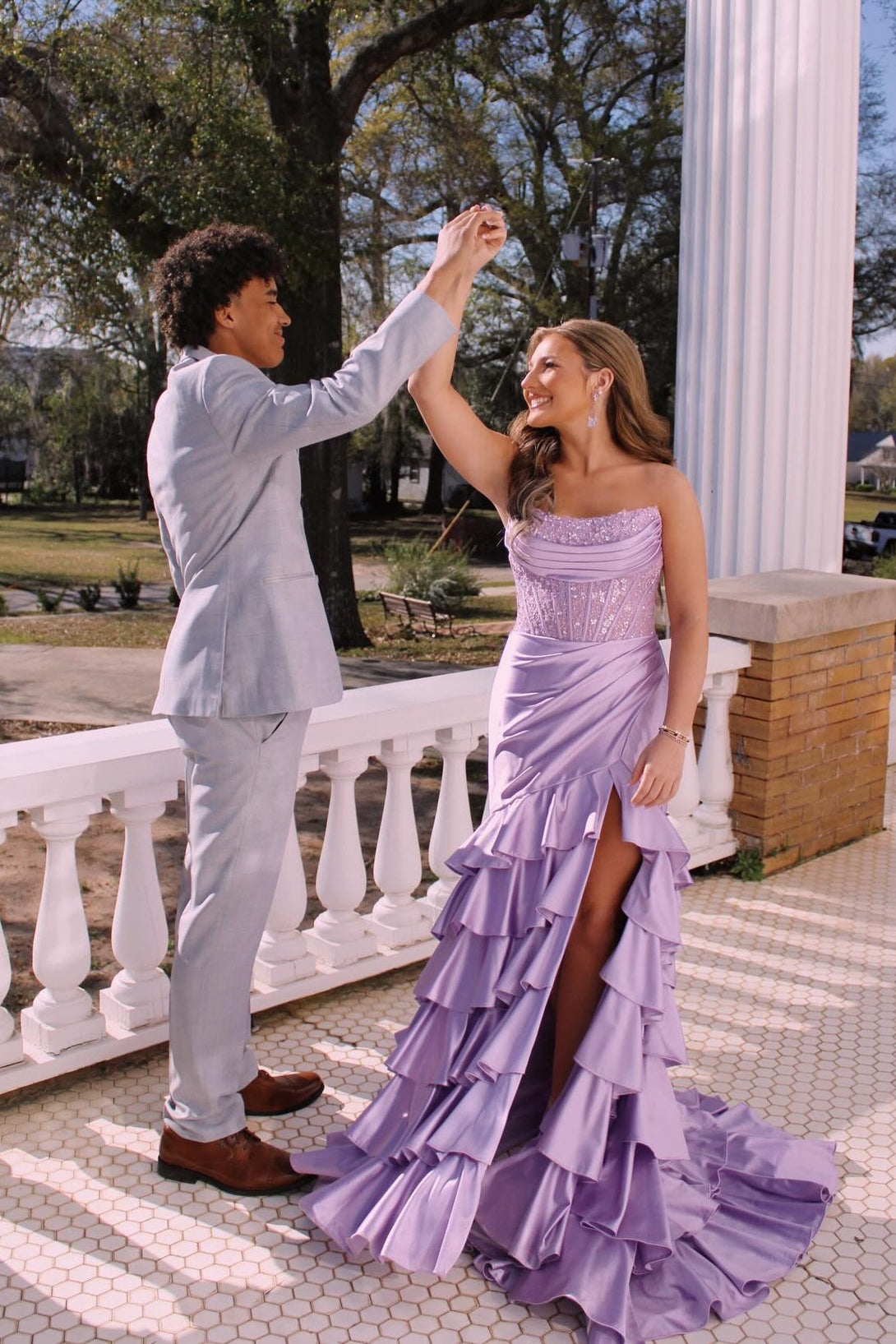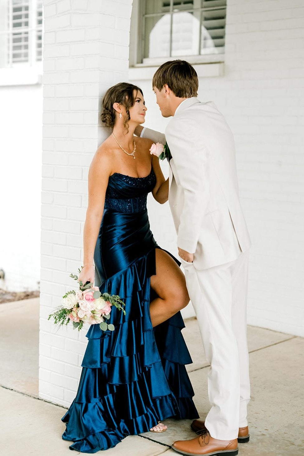 Royal Blue Mermaid Strapless Appliques Ruffle Prom Dress with Slit